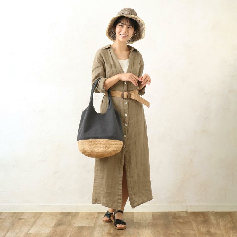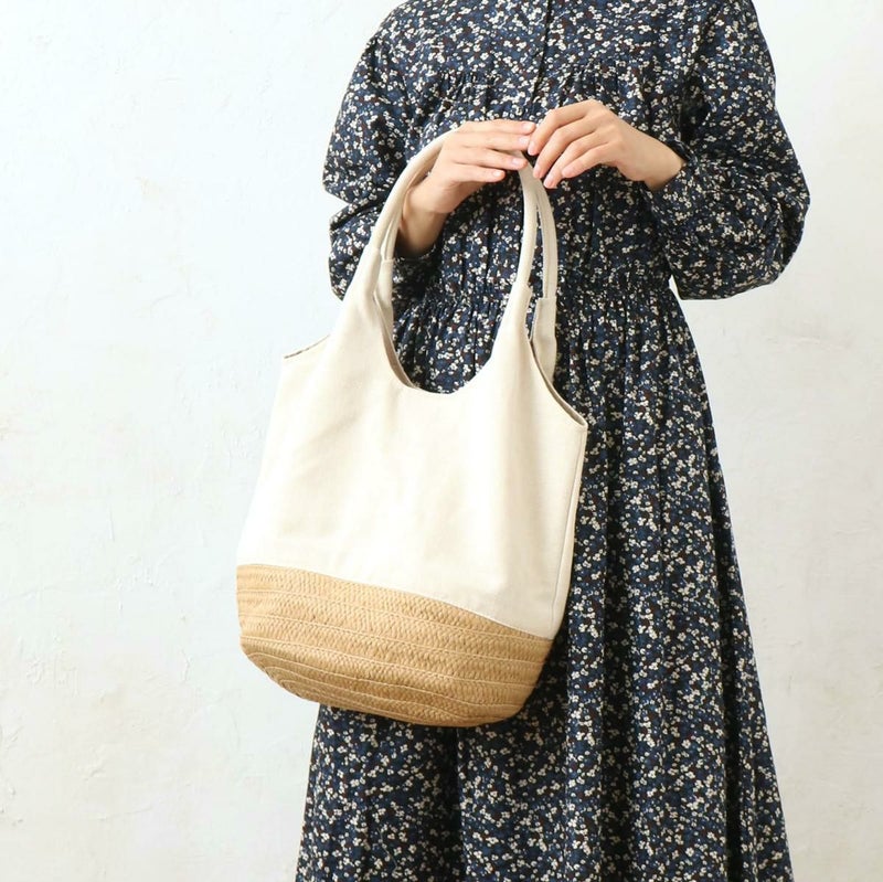 ナチュラルな素材を組み合わせた、夏らしいクリテ型トートバッグです。生地とコンビになっているので春先から秋まで長い期間使って頂けます。肩に掛けられるので持ち運びしやすく、荷物がたっぷりと入って使い勝手抜群なバッグです。カジュアルながらも洗練された印象を与え、幅広いコーディネートに馴染みます。