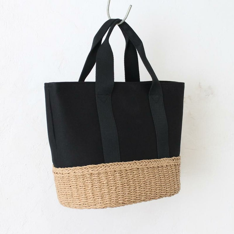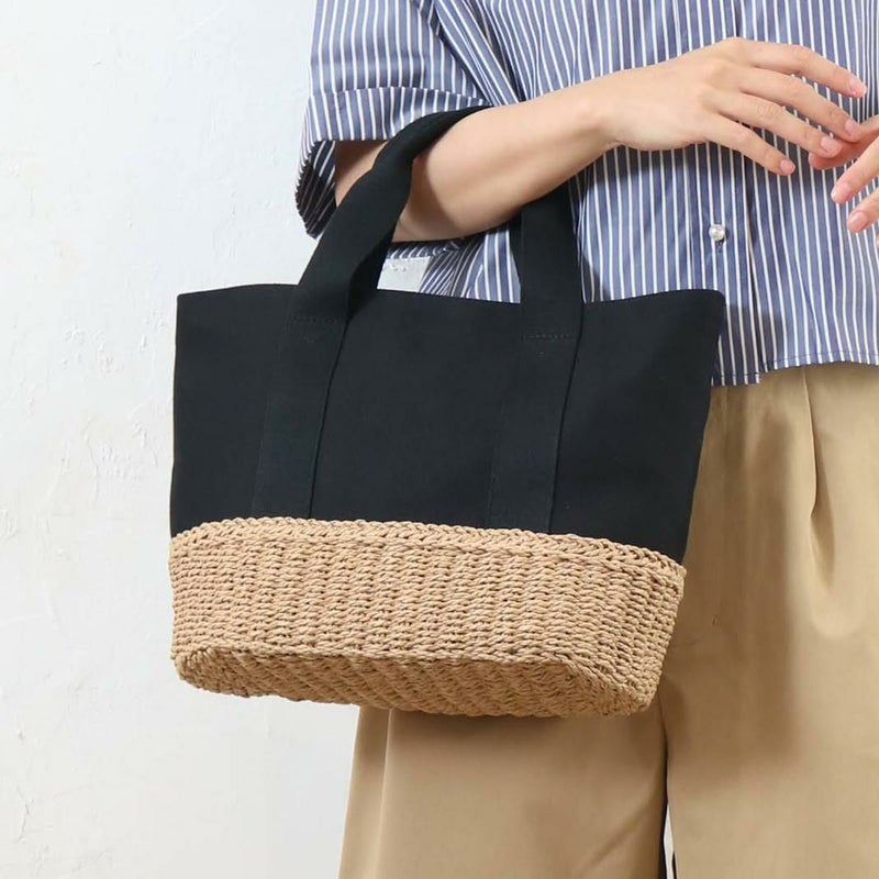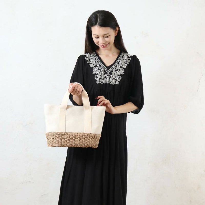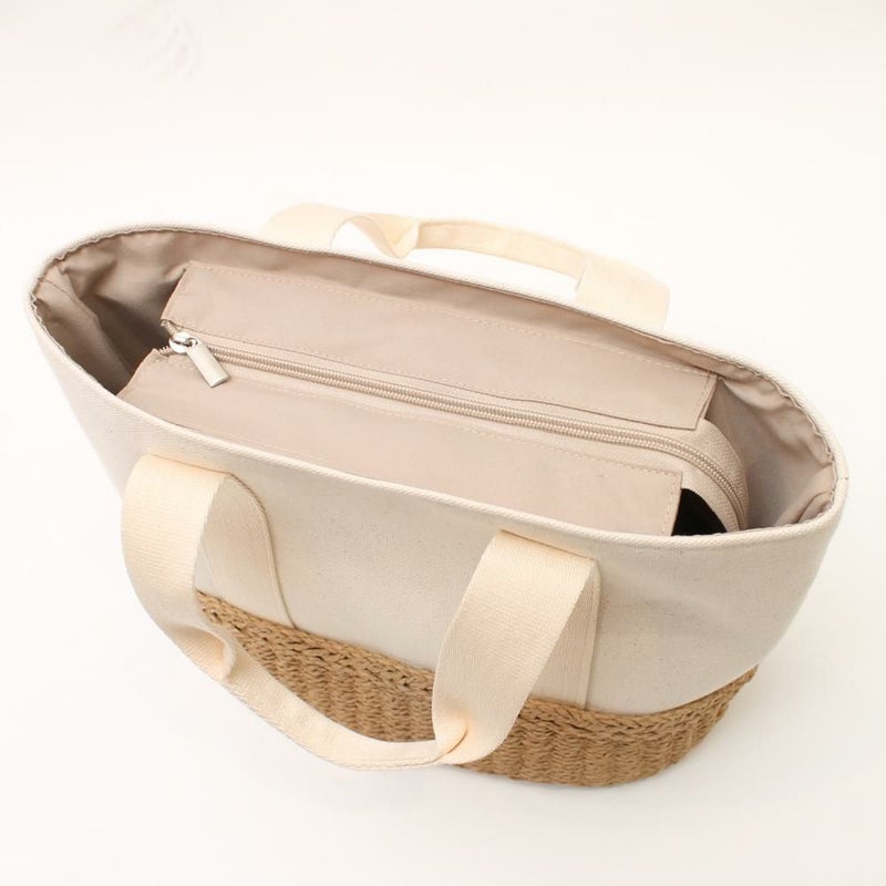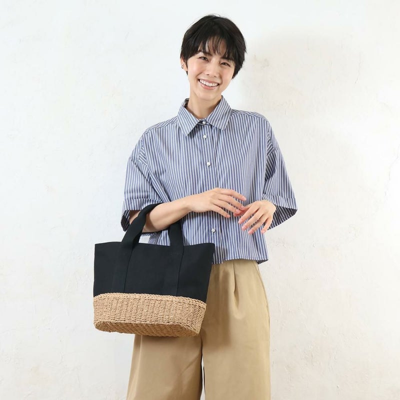 爽やかなキャンバス地と、涼しげな雑材のコンビネーションが魅力のトートバッグです。夏らしいざっくりとした雑材と、カジュアルなキャンバス地を組み合わせました。シンプルながらも、異素材のコントラストが目を引きます。長財布やスマートフォンなど、お出かけに必要なものがしっかりと収まります。デニムやTシャツなどのカジュアルスタイルはもちろん、きれいめなスタイルにも合わせやすいです。
