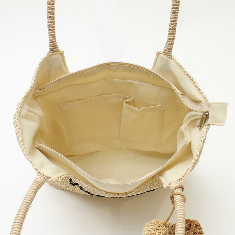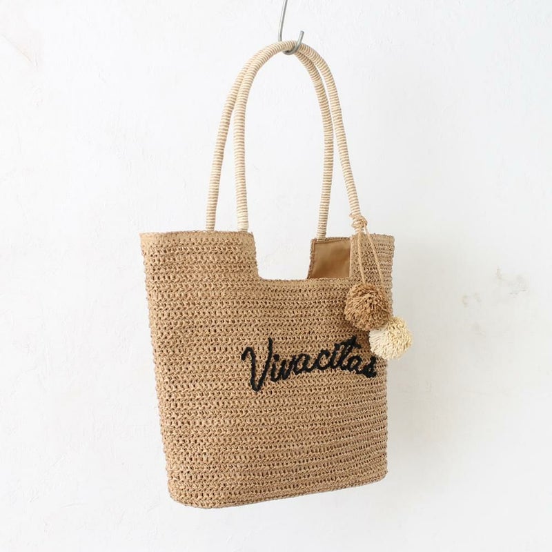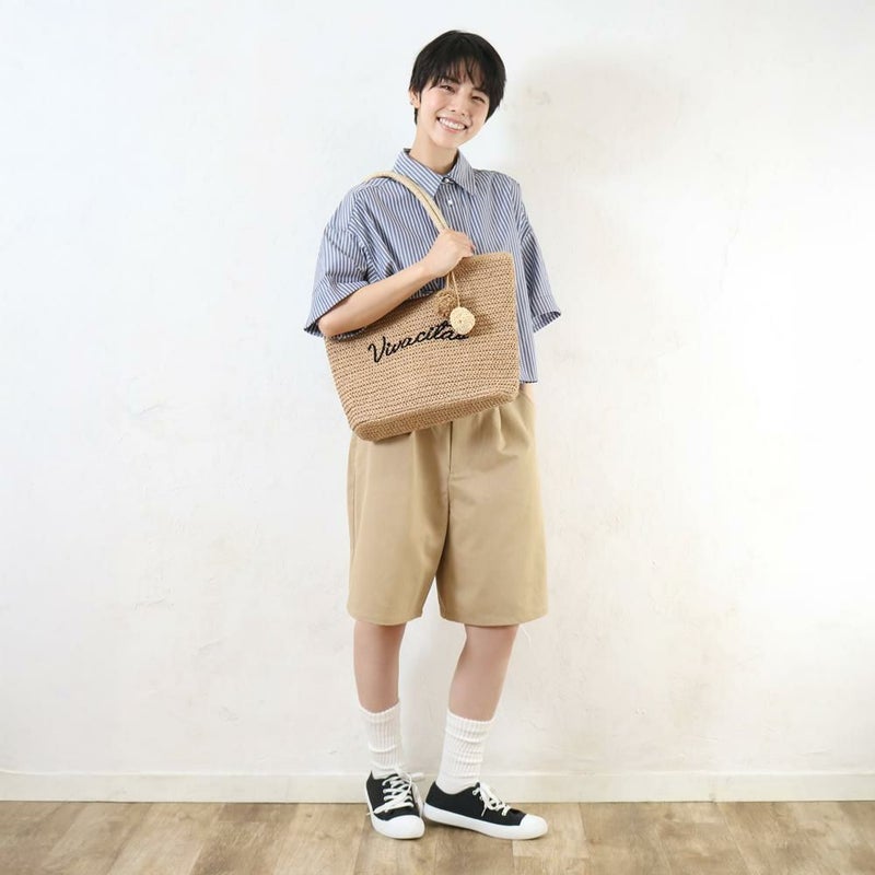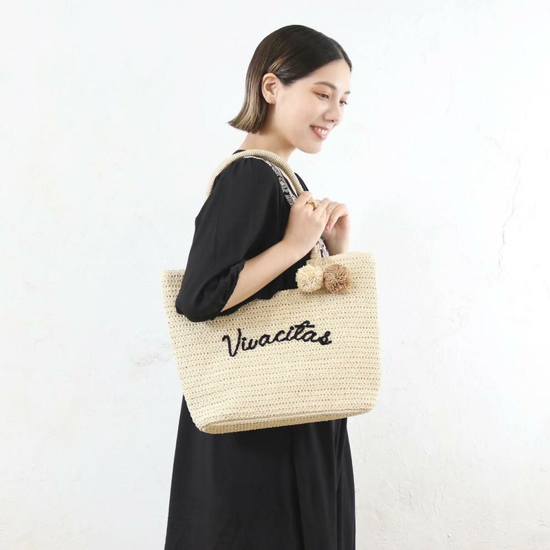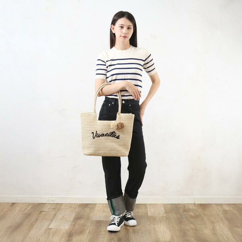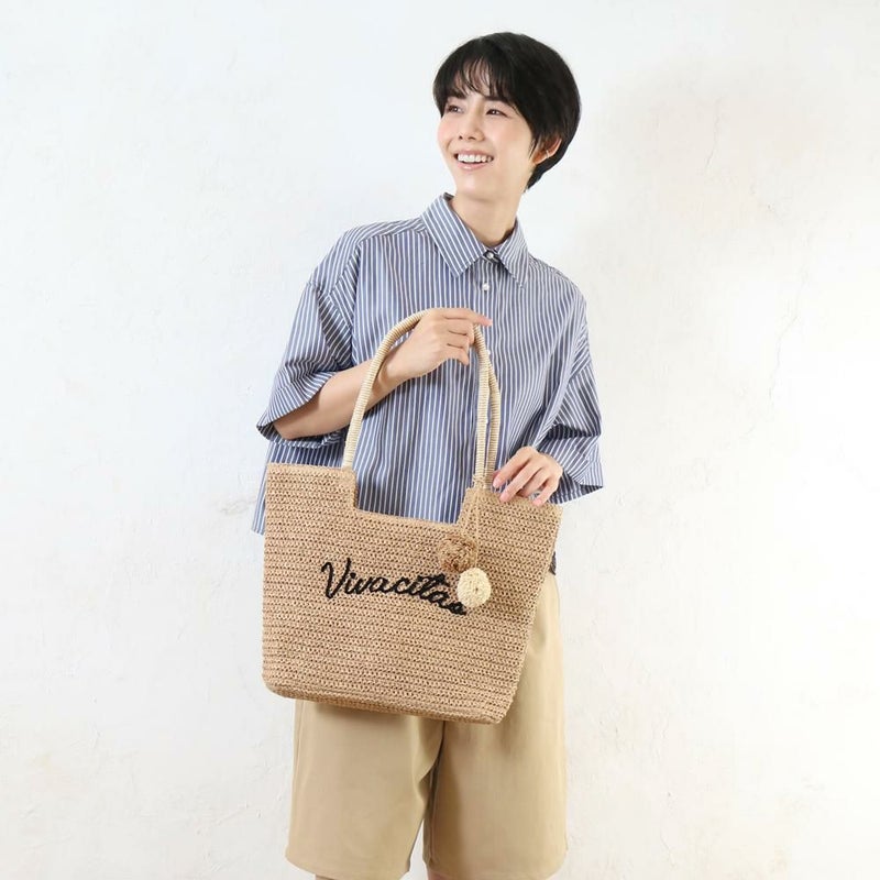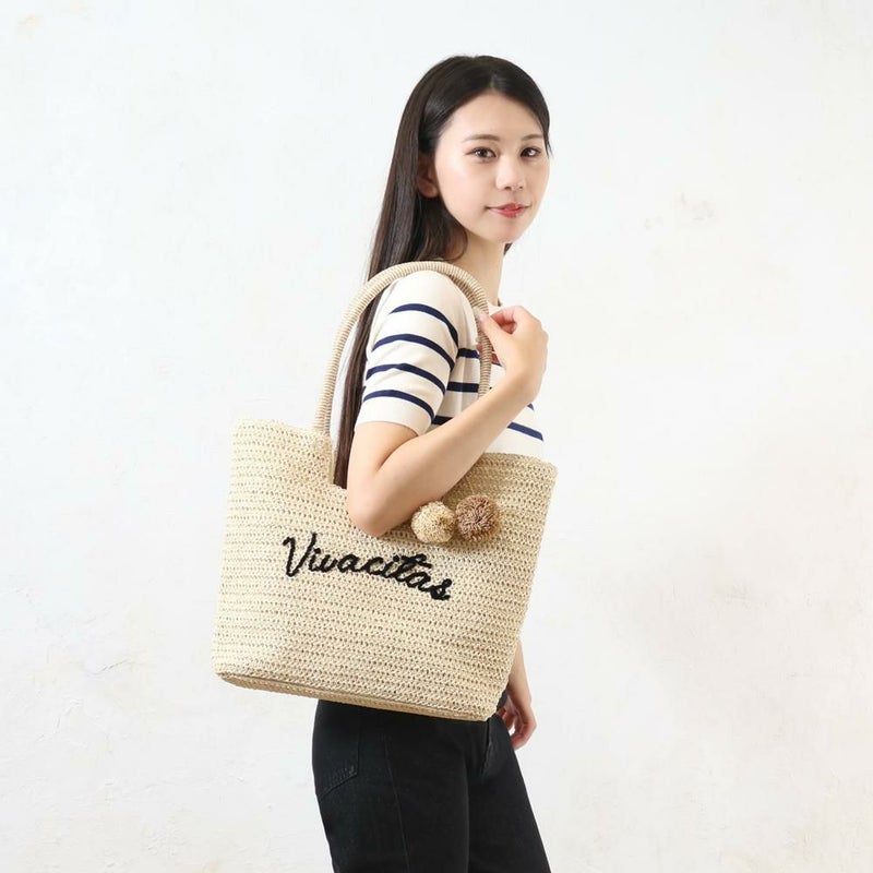 ロゴはサガラ刺繍で高見え。本体は軽くシンプルなのでスタイリングにも合わせやすい。ペーパーのポンポンは取り外しもできアクセントになり、いつものコーデを盛り上げます。ペーパー素材は軽さと柔らかさがポイント。マチ幅も広く、容量がたくさん入るのも嬉しいポイントです!