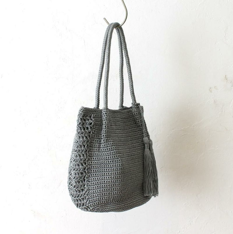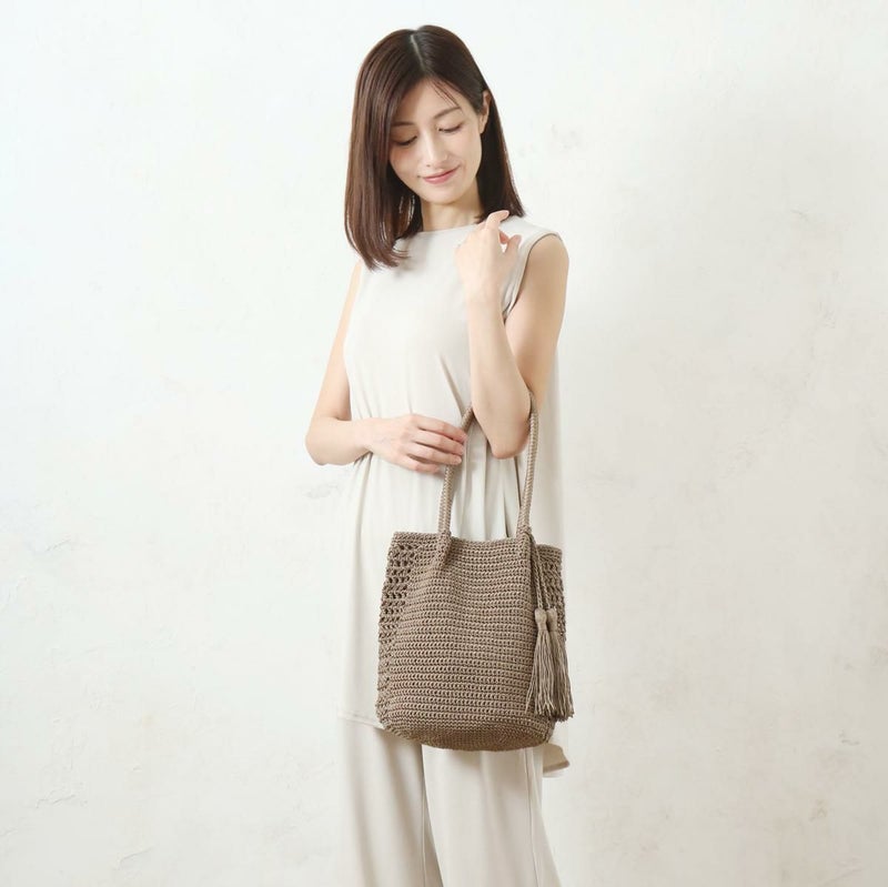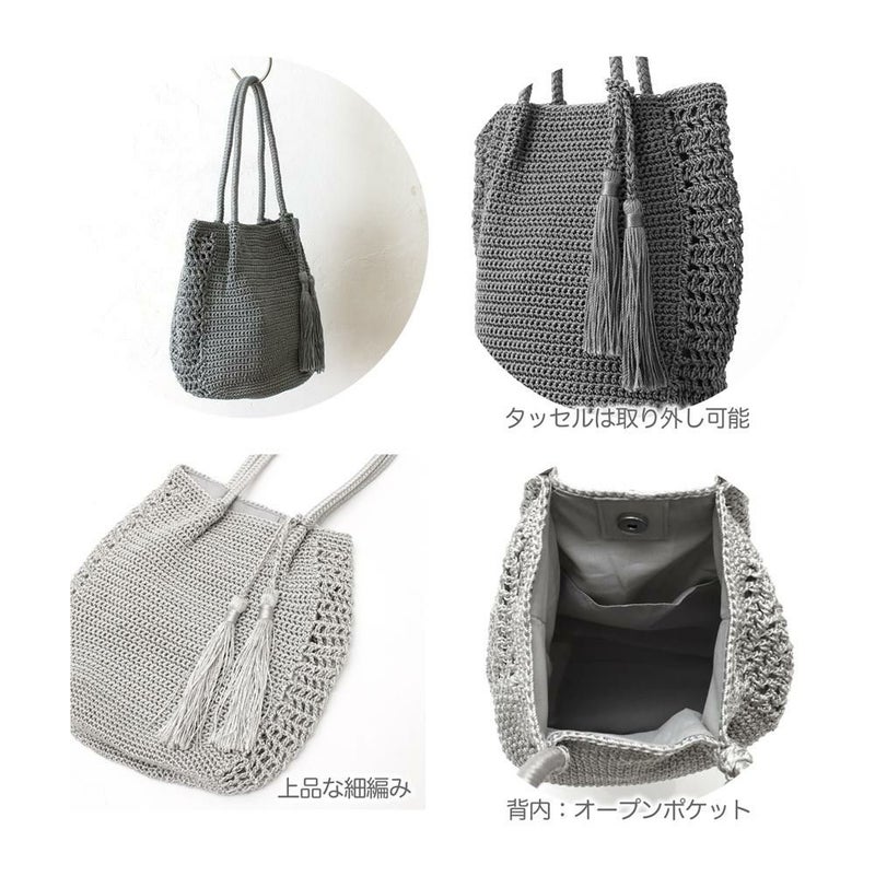 前後は細編み、サイドは透かし編みのデザインのコード編みトート。持ち手部分にはタックが入っている人気の形です。タッセルチャーム付きで高見えしコーディネートを引き立ててくれます。