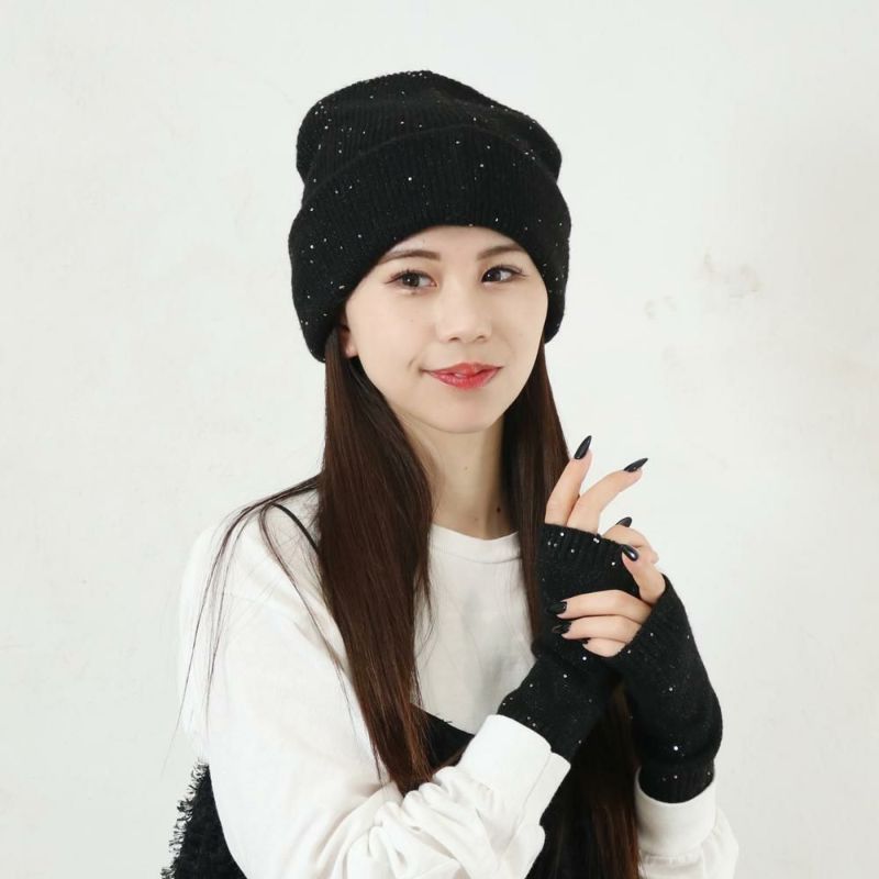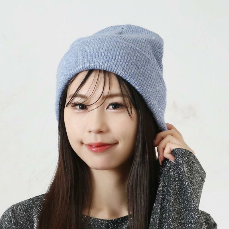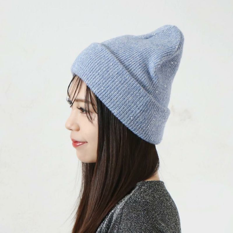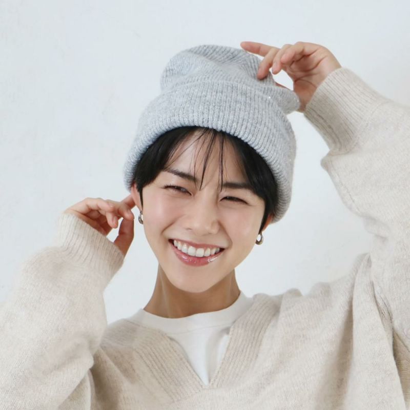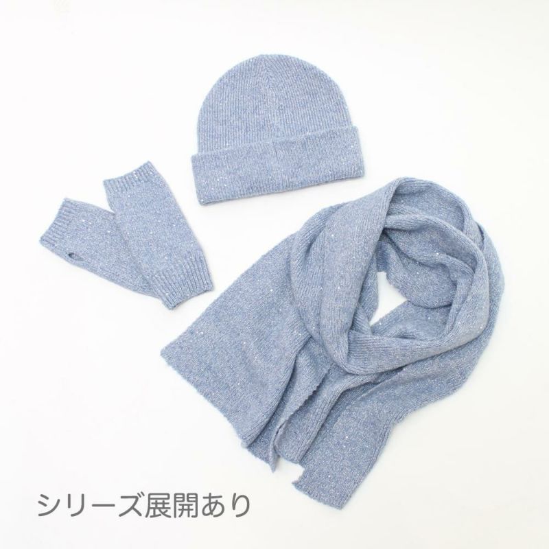 小さなスパンコールが散りばめられた、ラメ入り糸を使用したニット帽。上品でさりげないキラキラ感で、コーディネトのアクセントに◎同素材のアームウォーマー、ストールも展開しております。