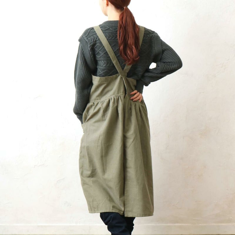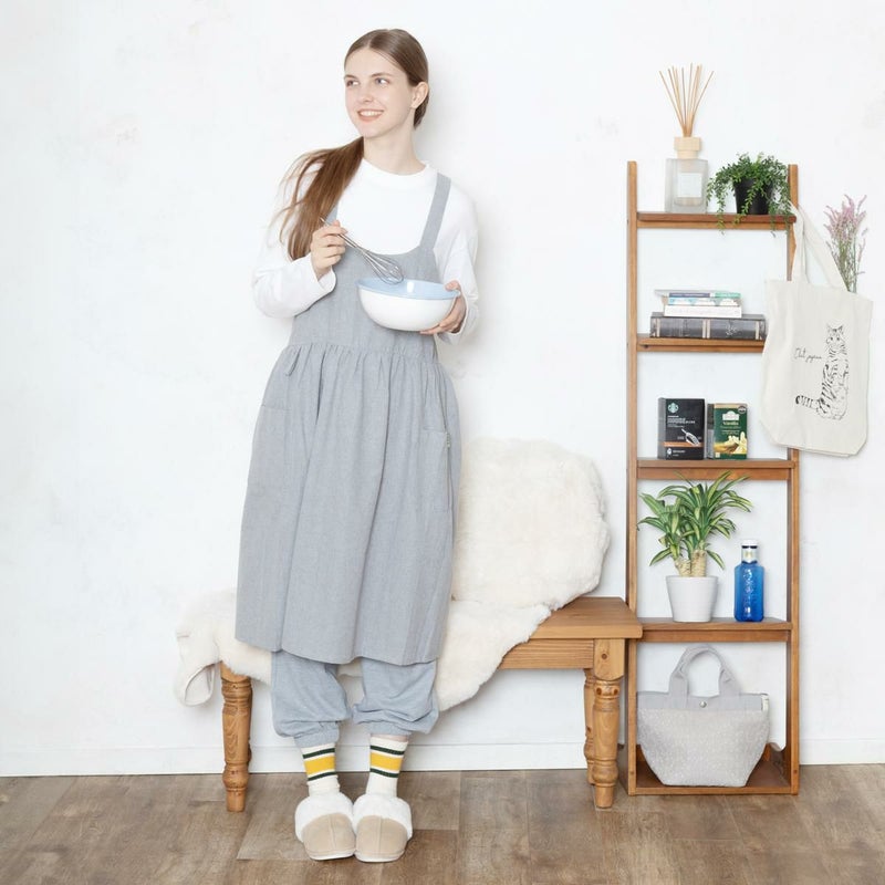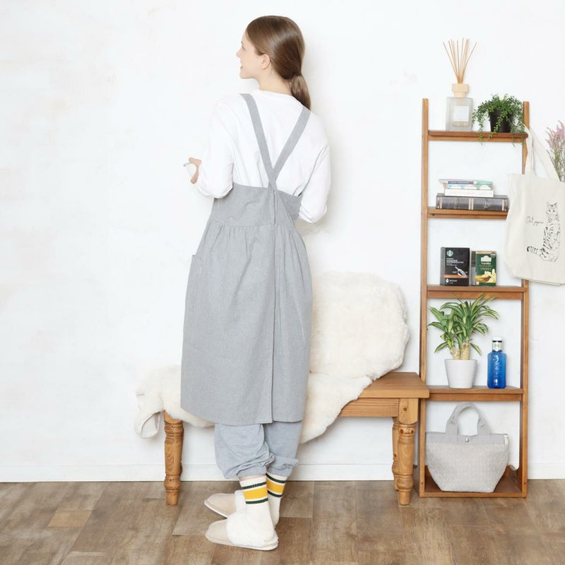 柔らかなリサイクルコットンを使用したHタイプエプロン。ウエストにギャザーが入っておりふんわりとしたフレアなシルエットがかわいいエプロン!ワンピースのように見えるので、着たまま近所へお出かけもできちゃいます! #10729