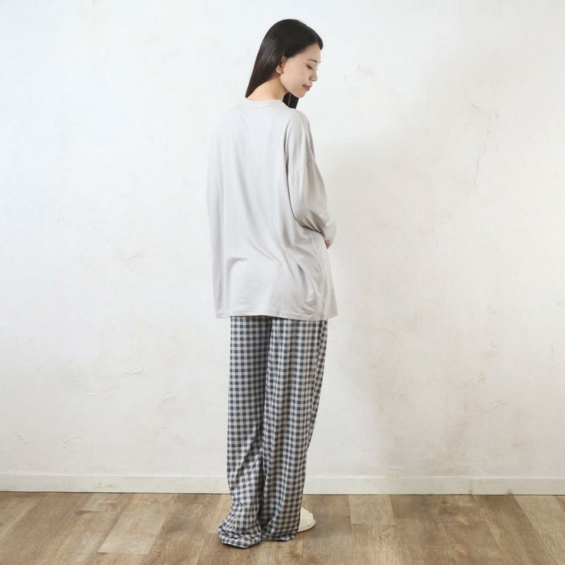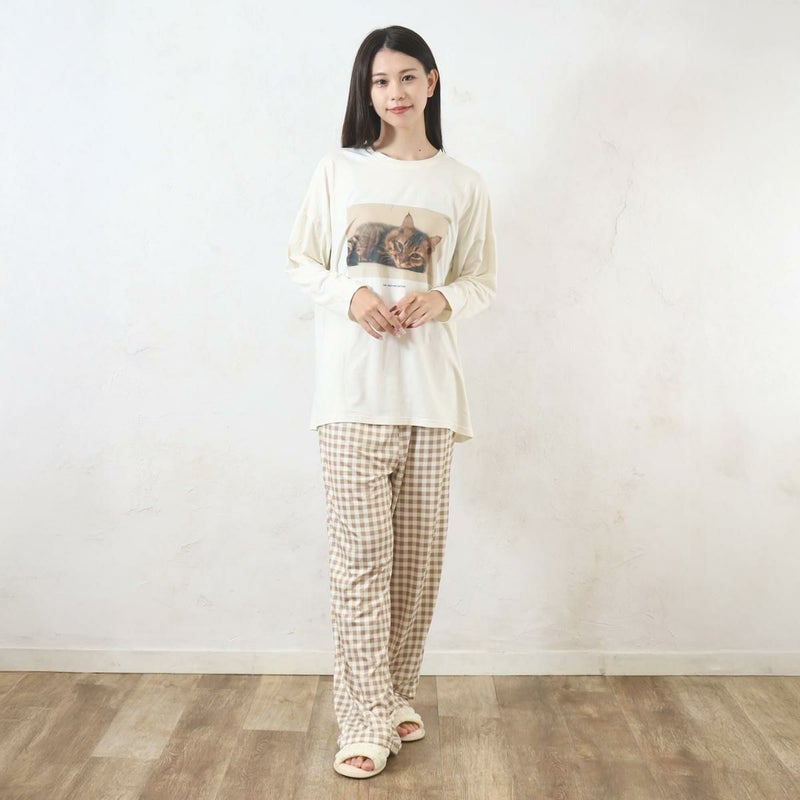 伸縮性のある柔らかな生地で、リラックスした着心地を実現しました。チェック柄のパンツと、かわいい猫のフォトプリントがポイントです。季節の変わり目にも快適に過ごせるルームウェアです。 #260113