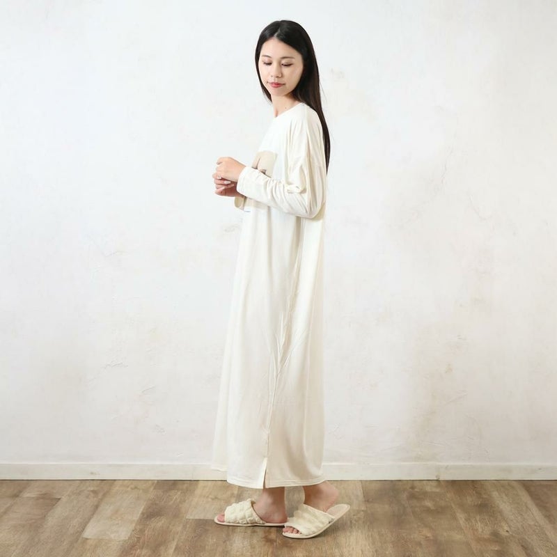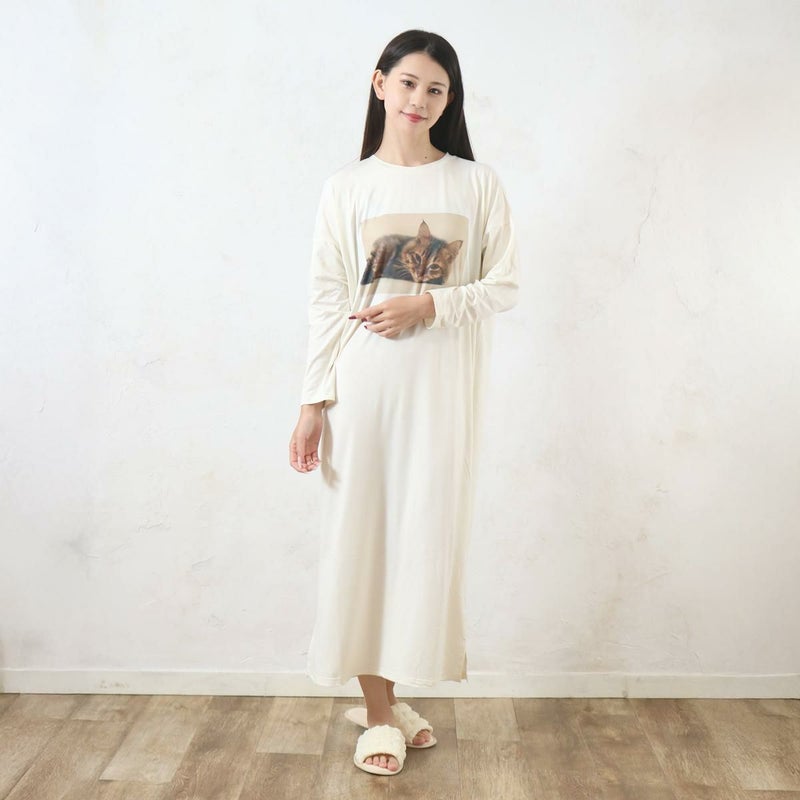 伸縮性のある柔らかな生地で、リラックスした着心地を実現しました。チェック柄のパンツと、かわいい猫のフォトプリントがポイントです。季節の変わり目にも快適に過ごせるルームワンピースです。 #260113