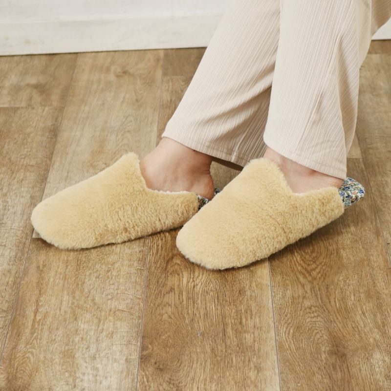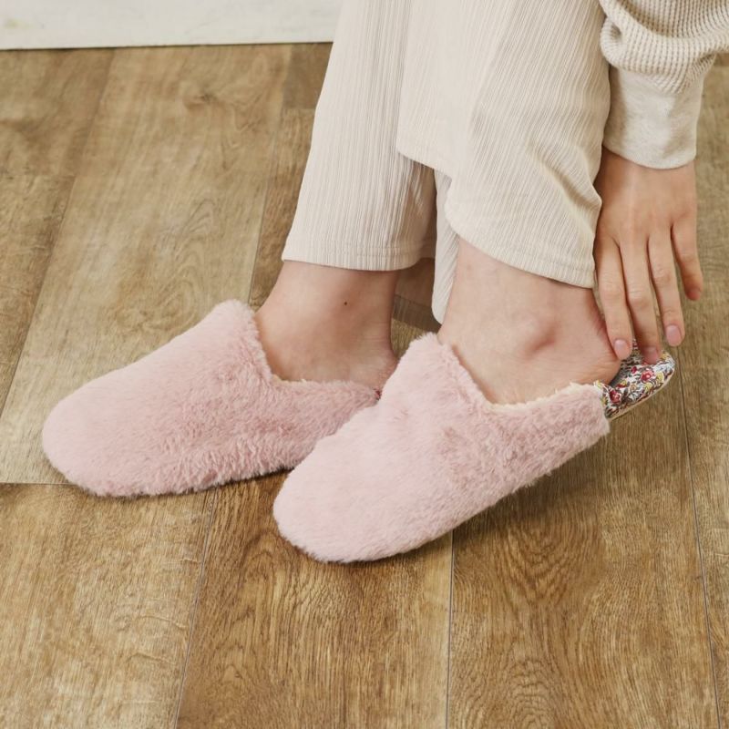 ふわふわのエコファー素材と、内側のシープボアで足元ぽかぽか。かかと部分には華やかなフラワー柄をあしらい、見た目も可愛く仕上げました。おうち時間がもっと心地よくなるルームシューズです♪