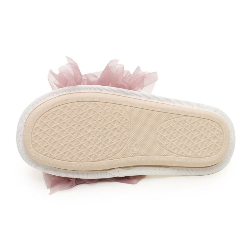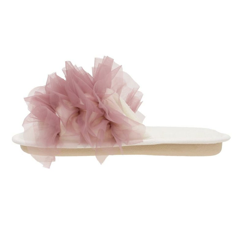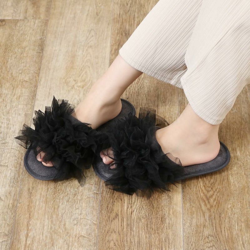 ふんわりとボリューミーなフリルが目を引く、ルームシューズです。足元を華やかに彩り、お部屋でのリラックスタイムをより贅沢なものにしてくれます。幾重にも重ねられたフリルが、エレガントで可愛らしい印象を与えます。ソールはクッション性があり、足に優しくフィットします。フローリングの上でも滑りにくく、安心してお使いいただけます。※シューズはデザイン・素材により試着感がサイズ表記と異なる場合がございます。予めご了承ください。