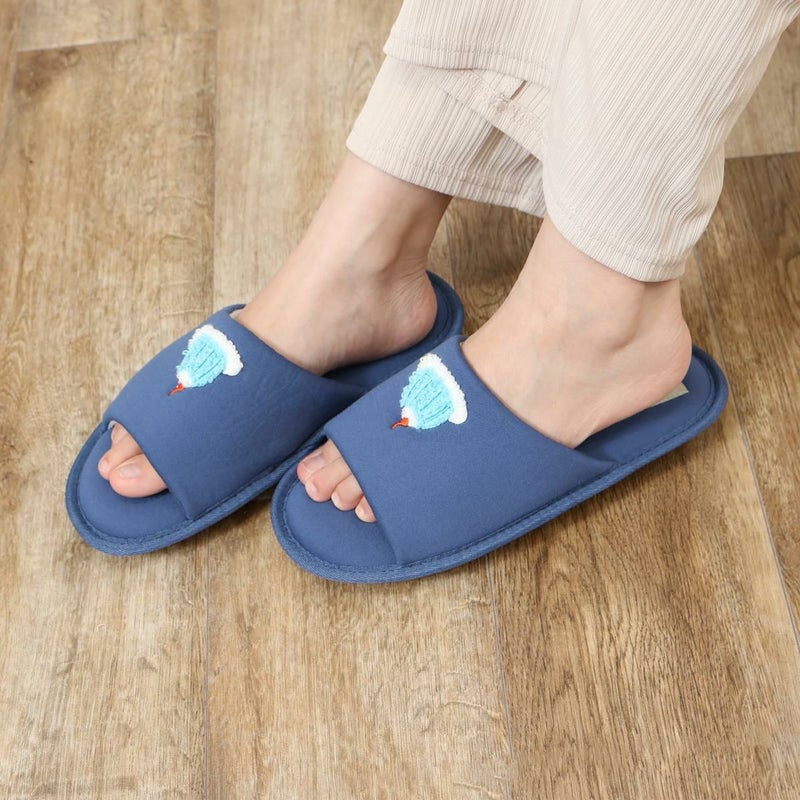 さらっとした履き心地の冷感ルームシューズ、底面素材は合成底なので滑りにくく歩きやすい、さがら刺繍がポイントです。
