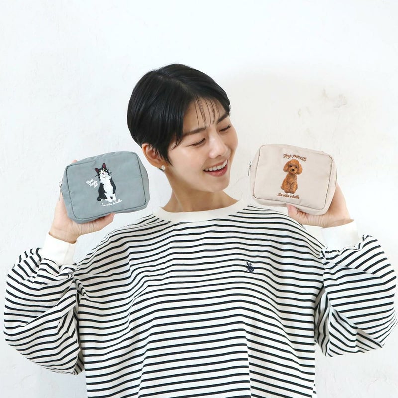 愛嬌のある表情が可愛い犬と猫の刺繍がポイントのポーチです。ポケットがメッシュなので見えやすく、旅行に持っていく充電器や小物入れにぴったりサイズです!