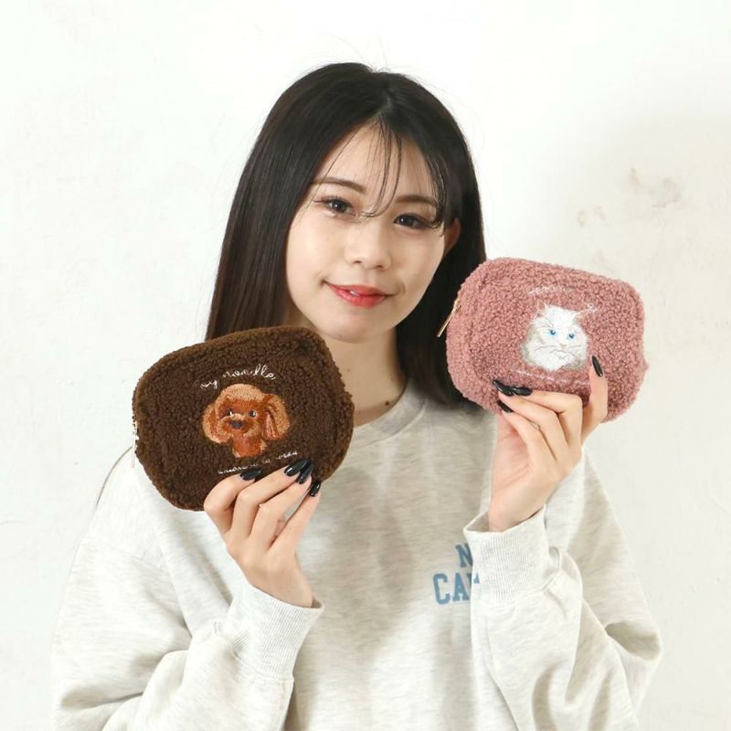ボアに愛嬌のある表情が可愛いポイントのポーチです。ポケットがメッシュなので見えやすく、旅行に持っていく充電器や小物入れに◎