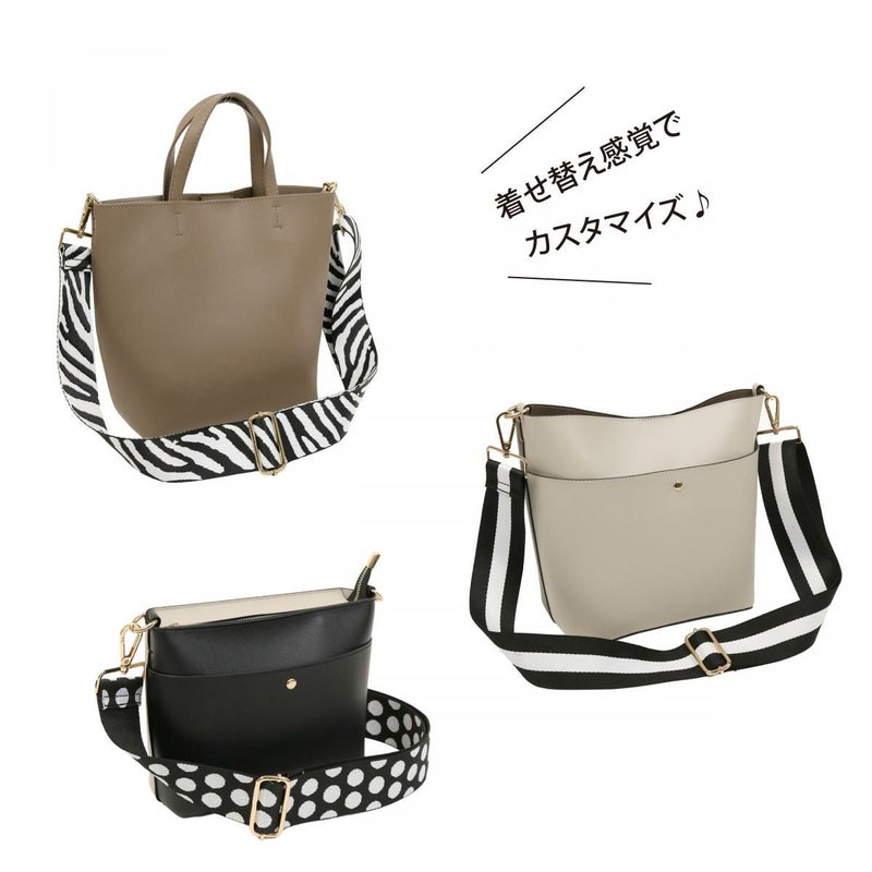 お好みに合わせて、お手持ちのバッグを着せ替え感覚でカスタマイズ出来るショルダーストラップ。コーデのアクセントになる幅広テープを使用。長さ調節可能で、簡単に付け替え可能。ドット柄等のベーシック系の展開で、ゴールド金具を使用したシリーズです。