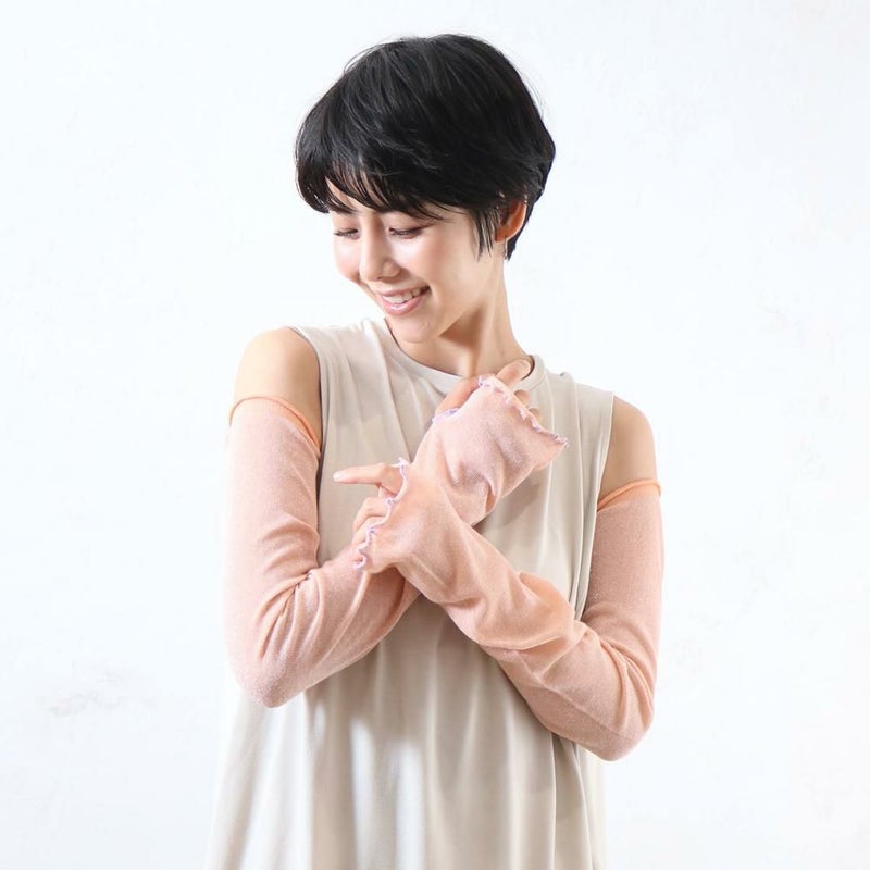 さりげなくラメが輝く、シアー素材のアームカバーです。くしゅくしゅとしたフリルが可愛らしく、二の腕から指先までおしゃれにカバーします。通気性がよく、夏の紫外線対策や冷房対策にぴったりのアイテムです!